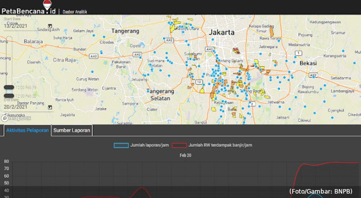 Laporan BPBD DKI Jakarta dan petabencana.id hingga Sabtu malam 20 Februari menyebutkan dalam 24 jam terakhir ada 349 laporan dari masyarakat dan 142 RW di Jakarta telah terdampak banjir. (BNPB)