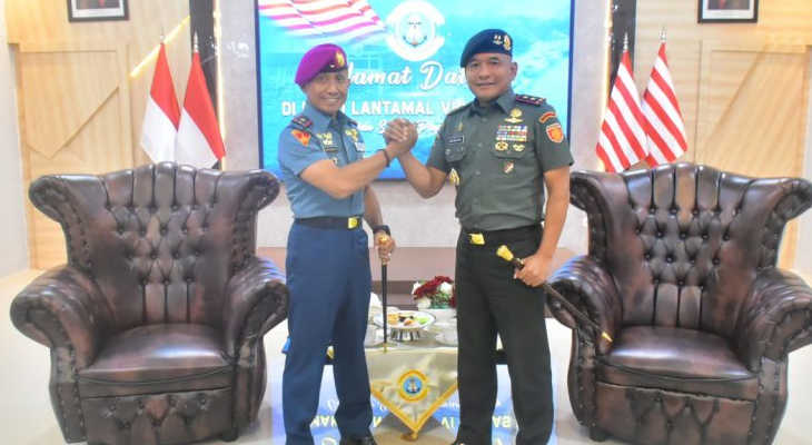 maiwanews – Kunjungan kehormatan Panglima Divisi Infanteri (Pangdivif) 3 Kostrad Mayor Jenderal TNI Bangun Nawoko, S.I.P., ke Lantamal VI disambut baik oleh Danlantamal VI Makassar Brigadir Jenderal TNI (Mar) Andi Rahmat M., beserta para PJU Lantamal VI di teras Mako Lantamal VI dan diterima di ruang Macan Kumbang Mako Lantamal VI, Senin (10/06/2024).