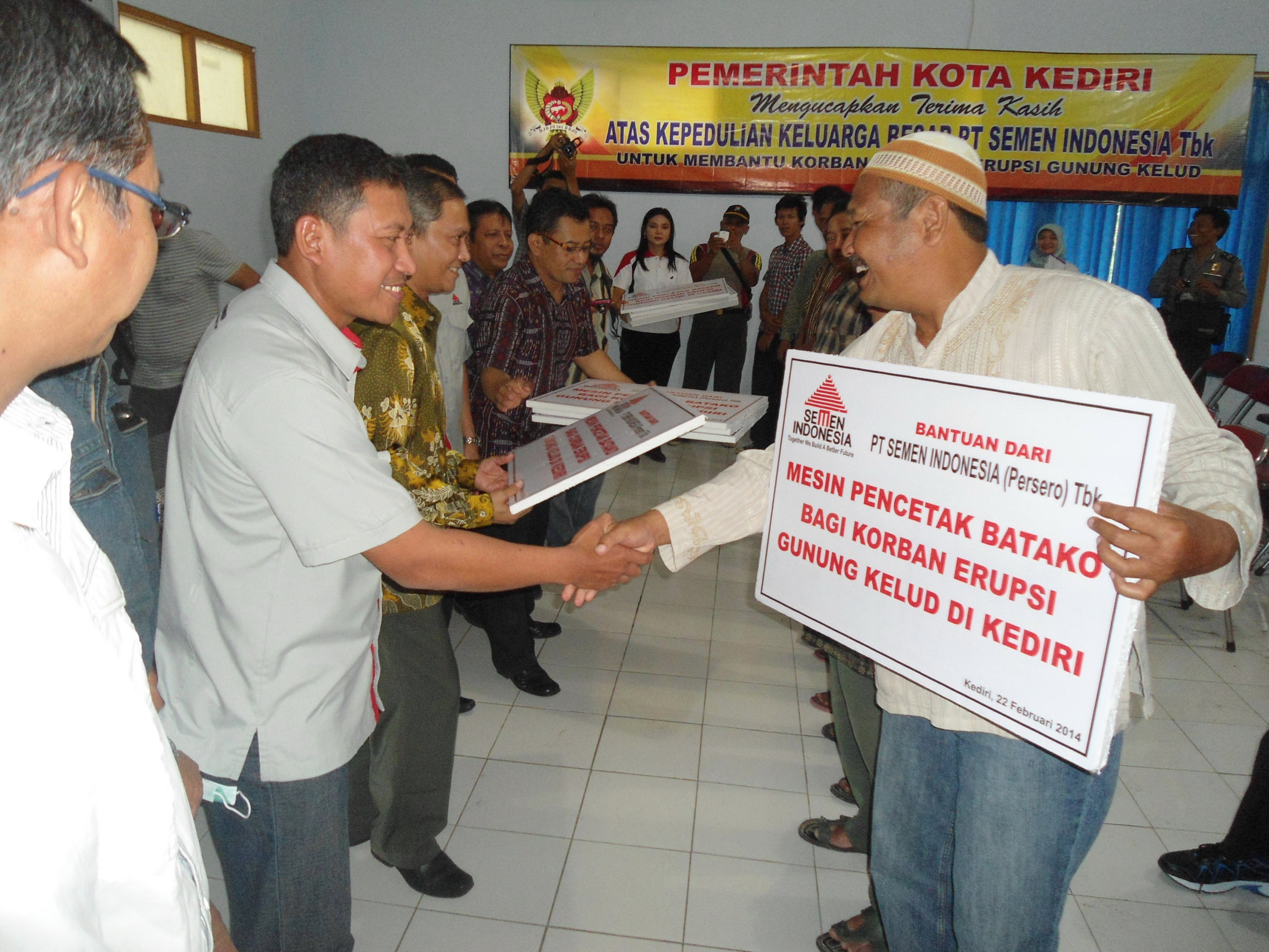 mawanews– Kepedulian PT Semen Indonesia (Persero) Tbk terhadap korban letusan gunung kelud terus dilakukan, setelah pemberian bantuan kebutuhan pokok yang disalurkan melalui tiga posko di Kediri, Blitar dan Malang. Pada hari ini melalui program corporate social responsibility (CSR) PT Semen Indonesia memberikan bantuan 10 unit mesin pencetak batako senilai Rp. 300 juta yang diberikan secara simbolis oleh Direktur Komersil Semen Gresik Aunur Rosidi disaksikan oleh Walikota Kediri dr.H.Samsul Azhar di kantor kecamatan Mojoroto, kota Kediri (22/02).