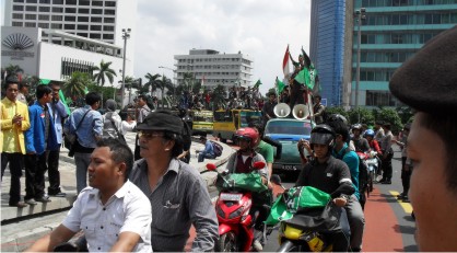 Tak lama kemudian, massa HMI yang mengendarai sejumlah bus Metromini datang ke bundara HI dan hanya berputar – putar beberapa kali sambil berorasi di atas bus mengecam pemerintahan SBY Boediono yang mereka anggap telah gagal, lalu bergerak meninggalkan Bundaran HIÂ menuju depan istana Merdeka lebih dahulu.